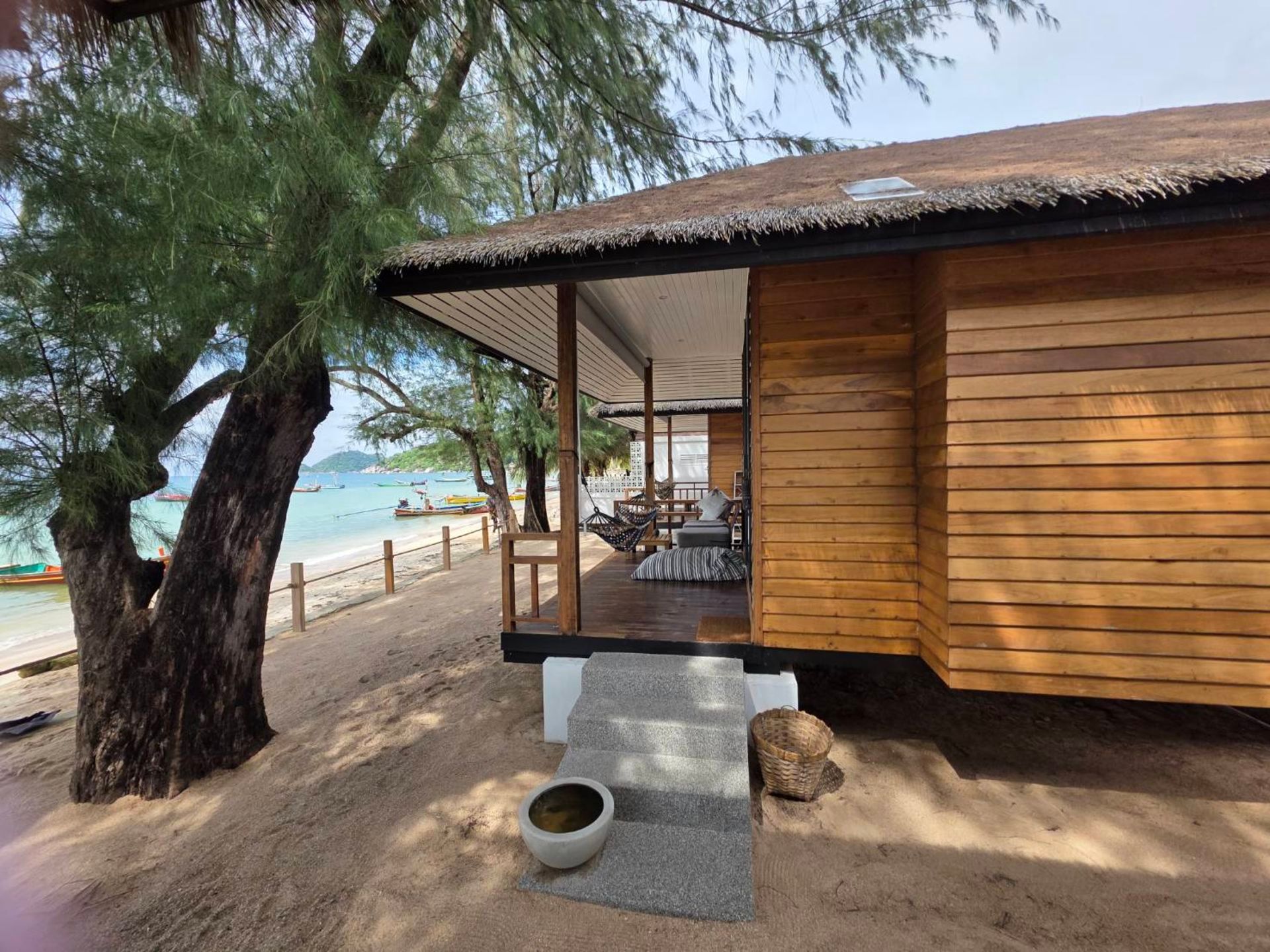 Right on the beach—just steps from the water! Enjoy stunning sunsets from your private balcony hammock. Each bungalow has a cozy double bed and sleeps 2 guests. Features include air-con, fridge, hot shower, tea/coffee, safety box, and of course, that relaxing hammock.